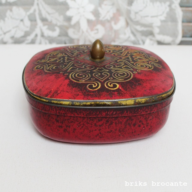 op de deksel (sleetse) goudkleurige versieringen in reliëf en een goudkleurige knop
